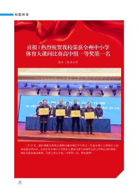 校园纵览 喜报 | 热烈祝贺我校荣获全州中小学 体育大课间比赛高中组一等奖第一名 图文 | 校办公室 1 月 17 日,湘西州教育和体育局举行湘西州青少年体育工作暨全州中小学体育大课 间比赛总结会议,会议对在全州中小学体育大课间比赛中表现突出的工作单位进行表彰, 我校凭借卓越的表现,荣获全州高中组一等奖第一名。特此报喜! 10