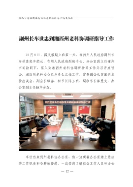 工作 副州长车世忠到湘西州老科协调研指导工作 10 月 8 日,国庆假期上班第一天,湘西州人民政府副州长 车世忠轻车简从,在州人民政府副秘书长、办公室副主任谢翔 宇的陪同下,深入到湘西州老科协调研指导工作并召开座谈 会。湘西州老科协会长龙春生汇报工作,常务副会长贾维剑主 持座谈会,副会长滕春、秘书长陈玉明、副秘书长郭曼文、办 公室副主任杨华参加。 车世忠来到州老科协办公室,他一边观看办公室墙上悬挂 的工作职责和各种荣誉牌,一边咨询了解驻会工作人员和办公 — 12 —