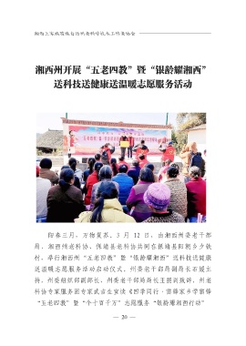 工作 湘西州开展“五老四教”暨“银龄耀湘西” 送科技送健康送温暖志愿服务活动 阳春三月,万物复苏。3 月 12 日,由湘西州委老干部 局、湘西州老科协、保靖县老科协共同在保靖县阳朝乡夕铁 村,举行湘西州“五老四教”暨“银龄耀湘西”送科技送健康 送温暖志愿服务活动启动仪式。州委老干部局副局长石媛主 持,州委组织部副部长、州委老干部局局长王照训致辞,州老 科协专家服务团专家武吉生宣读《四季同行·雷锋家乡学雷锋 “五老四教”暨“个十百千万”志愿服务“银龄耀湘西行动” — 20 —