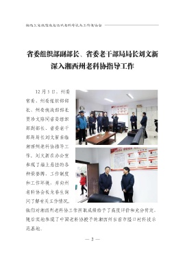 工作 省委组织部副部长、省委老干部局局长刘文新 深入湘西州老科协指导工作 12 月 5 日,州委 常委、州委组织部部 长、州委统战部部长 贾珍文陪同省委组织 部副部长、省委老干 部局局长刘文新亲临 湘西州老科协指导工 作。刘文新在办公室 参观了墙上悬挂的各 种荣誉牌、工作制度 和工作环境,并向州 老科协会长龙春生询 问了解有关工作情况。 他们对湘西州老科协工作所取成绩给予了高度评价和充分肯定, 随后实地参观了中国老科协授予的湘西州吉首市隘口村科技示 范基地。 — 2 —