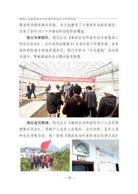 工作 镇老科协组织建设经验,有力地推进了乡镇老科协组织建设, 实现了全州 115 个乡镇老科协组织全覆盖。 建立专家团队:制定出台《湘西自治州老科协专家服务工 作试行办法》,由州老科协组建 85 名老专家工作服务团,县市 老科协组建专家技术服务队,推行专家与“示范基地”结对技 术指导,帮助基地和企业解决技术难题。 强化会员管理:制定出台《湘西自治州老科协个人会员管 理暂行办法》,明确个人会员入会条件、会员权利、会员义务 和会员考核办法,统一印制《湘西自治州老科协会员登记表》 — 42 —