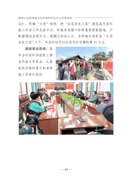 工作 法》,明确“六有”标准,把“示范会员之家”建设成为老科 技工作者工作交流平台、科技咨询窗口和科普资源集散地,不 断增强协会吸引力、凝棸力和向心力。全州确定老科协“示范 会员之家”9 个,州老科协实行以奖代补安排经费 21 万元。 组织举办活动:每 年全州老科协按照上级 老科协工作要求,认真 组织开展科普日和老科 技工作者日活动。 — 44 —